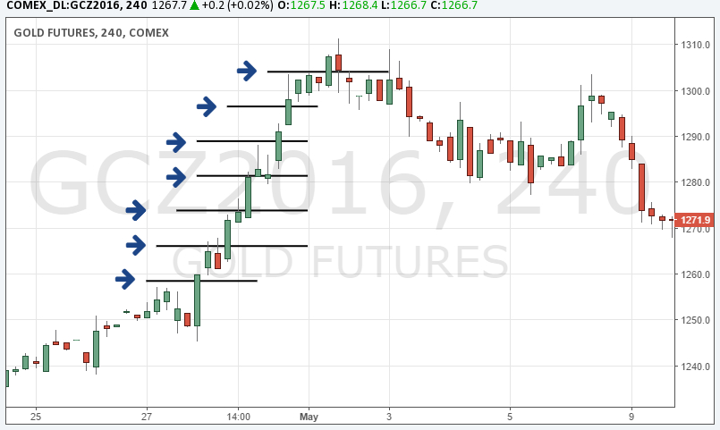 This is relatively a “conservative” approach and it uses swing points and the Dow Theory. During a rally, price usually makes higher highs and between swing points we see retracements. Entering on the retracement is what we explained with the moving average and the trendline technique. Entering on the break of a previous swing point gets you into a trade at a ‘worse’ price but it follows the premise that the trend is confirmed once price makes a higher high and momentum is supporting the trend.