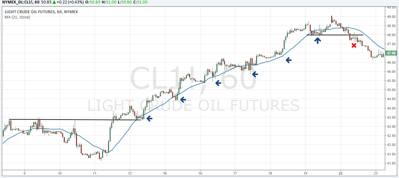 Using moving averages is probably among the most commonly used techniques when it comes to adding to an existing position during a trend or getting into a trade. The first question that comes up is, of course, which moving average period you should use. This highly depends on the market but if the market tends to make deep pullbacks, you should use a higher period setting. In the end, it’s a trial and error process, where you adopt the right moving averages to your method of trading.