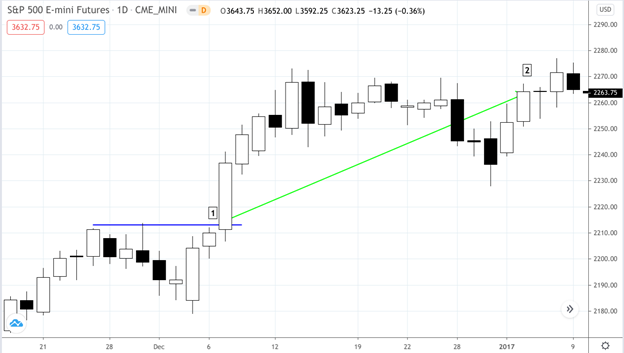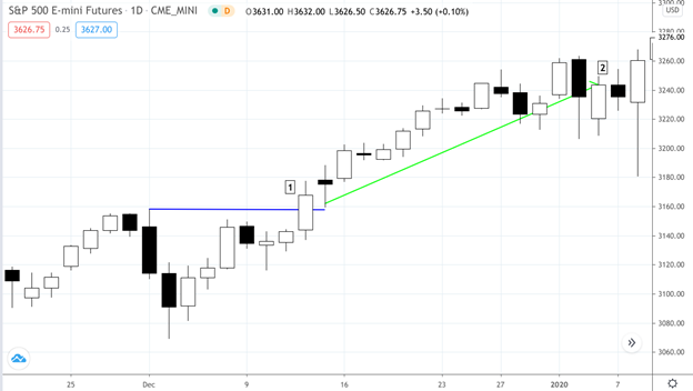 In the example above, the breakout of the previous swing high [1] in early December would have made a favorable entry point as it would any other trade. With a stop loss a few ticks below the previous swing low (which you can see on the chart), your exit at [2] might have yielded a strong profit; certainly more than the +0.4% return using the traditional approach that year.