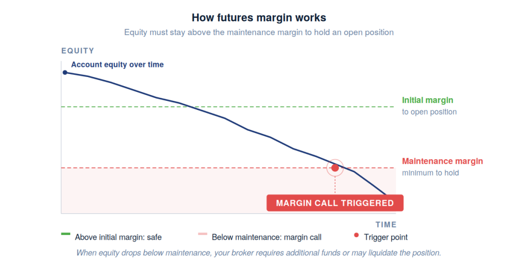 - Maintenance margin — the minimum balance required to maintain a position; if your equity falls below this level, you’ll receive a margin call