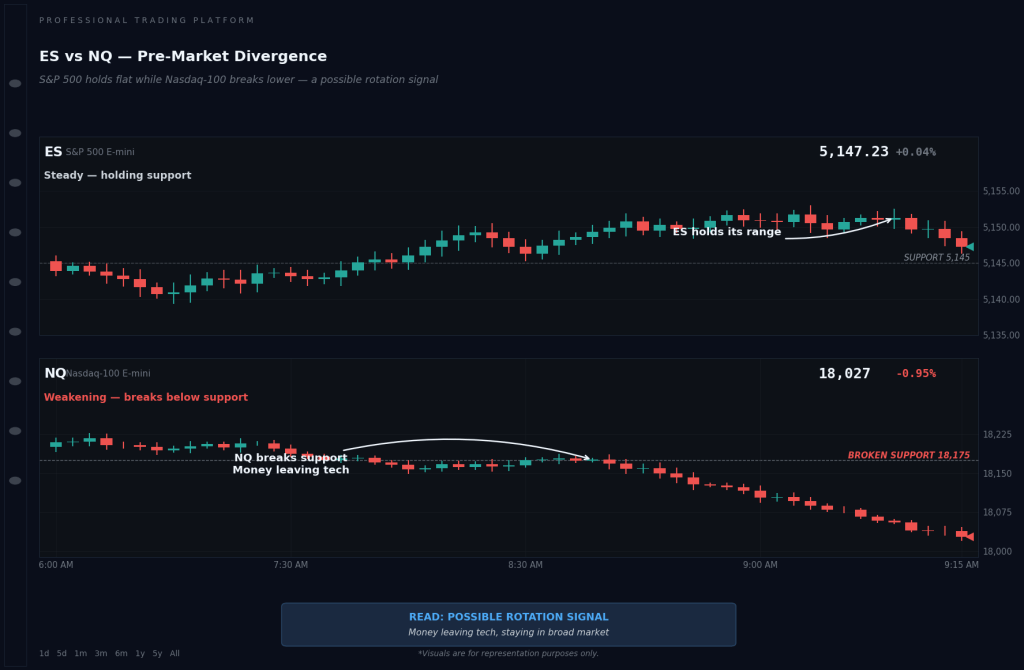 Example: ES holding steady while NQ weakens — a possible rotation signal.