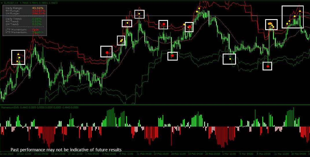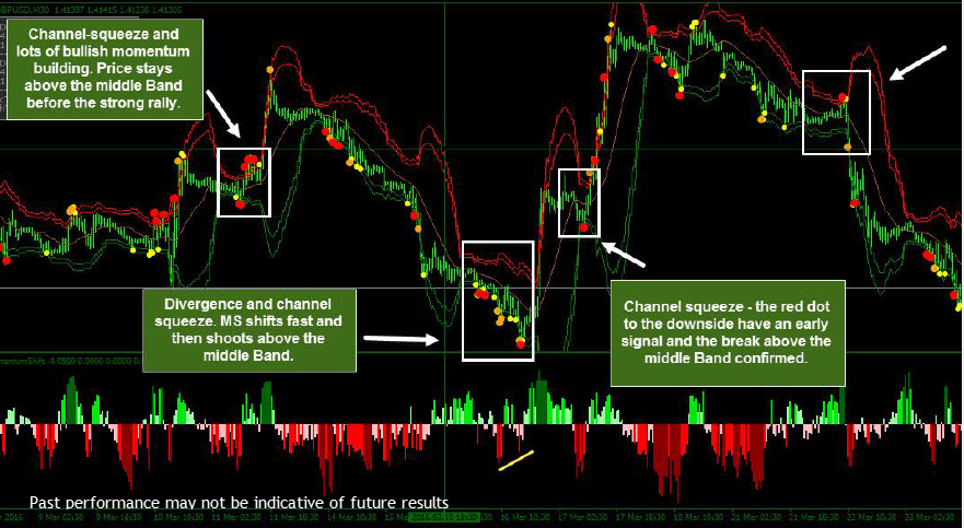 Just like conventional divergence, the Momentum Shift indicator signals that although the price is maybe making new highs and lows consistent with the ongoing trend, momentum within that trend may be slowing down.