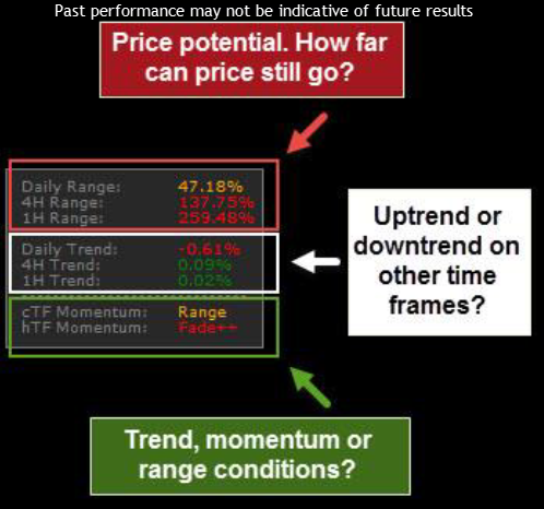 The Trend-Info box, located at the top left corner of the chart, lays out critical multi-time frame information, eliminating the need to switch between time frames for a birds-eye view or a narrowed down view for added perspective.