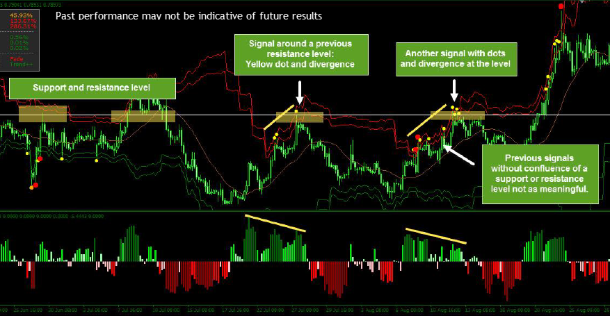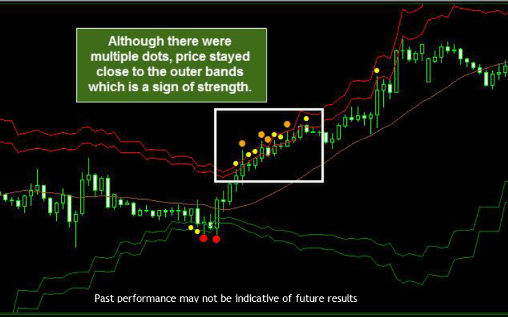 The orange and red dots point to highly overbought price violations and extremely overheated trends – mainly when they occur after a long trending period. Orange and red dots are strength signals, and you’ll see that they often work as standalone signals reasonably well.