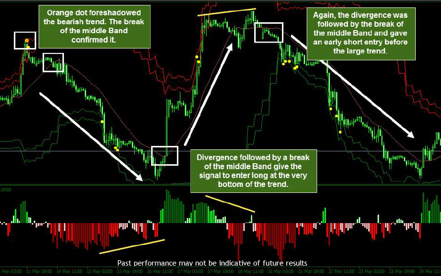 The middle band break (MBB) is a confirmation signal that adds even more weight to a developing trading scenario, especially after a channel violation or an MS divergence. The MBB allows us to combine what we have previously learned about the channel violations and the deviations to find signals and time trade entries.