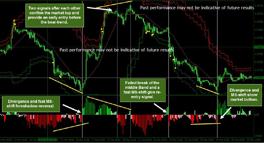 The divergence on the Momentum-Shift (MS) indicator is another compelling way of identifying trends that are likely to come to an end or approach a consolidation/pullback phase. A divergence exists if price makes a higher high, but the MS indicator does not make a new high. In the case of a bearish divergence, the price makes a lower low, but the MS indicator makes a higher low.