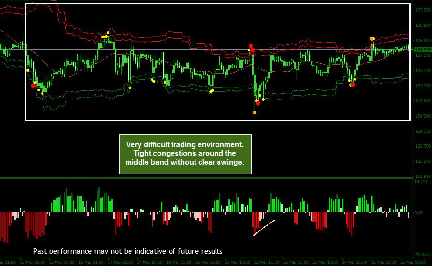 We have talked about how the MBB can be a good indication of market sentiment and a potential entry trigger for your trades, but be wary of these middle band breaks during periods of consolidation and when the outer channels are squeezed together showing tight trading activity.